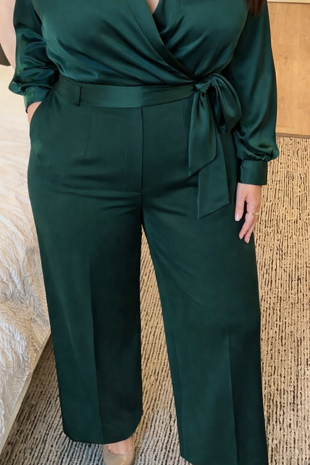 Close-up of a woman wearing a white lace crop top and green elastic waistband pants.
